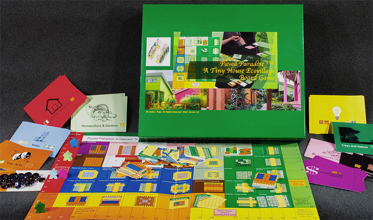 Create an ecovillage of tiny houses and micro businesses while simultaneously learning to strive for net-zero (NZ) impact on the planet. Players start with 45 NZ points, representing 45,000 lbs. of carbon dioxide (CO2), the amount the average U.S. citizen generates annually. Players try to decrease their points and reach NZ impact on the planet (to have 0 NZ Points), as well as aid a houseless person through the process.